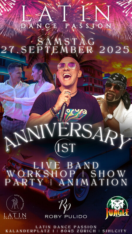 SAMSTAG, 27. SEPTEMBER 2025 Latin Dance Passion wird 1 Jahr alt und wir möchten das mit euch feiern! Wir laden euch herzlichst ein zu einer unvergesslichen Nacht ein voller Freude, Tanz und Musik. ✨ Salsa & Bachata mit Roby Pulido & Band - LIVE! ✨ Erlebt Roby Pulido und seine Band live auf der Bühne voller Energie, Rhythmus und Leidenschaft! Wir tanzen die ganze Nacht auf zwei Floors Salsa & Bachata. 👉 Zum Einstieg gibt es zwei Workshops, perfekt zum Warmwerden und Reinkommen. 👉 Premiere Show unseres Student Choreo Team 👉 Anschliessend grosse Party, heisse Beats, Animation und beste Stimmung! Line-up: * LIVE BAND * * SALSA WORKSHOP * * BACHATA WORKSHOP * * SHOW PREMIERE STUDENT TEAM * * ANIMATION * * DJ ENGEL * Timetable: 19:45 Doors open 20:00 Salsa Workshop 21:00 Bachata Workshop 22:00 Party 23:00 Show Premiere 23:15 Live Band Eintritt 25 CHF Mach dich bereit für eine grosse Feier! 🎶🔥 Party | Workshops | Show | Animation | Live Music www.thejungleclub.ch