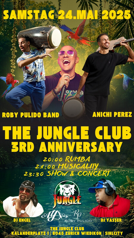 🎉 3 JAHRE THE JUNGLE CLUB! 🎉 Seid dabei, wenn wir unser 3-jähriges Jubiläum gebührend feiern! Am 24. Mai 2025 um 19:45 Uhr verwandeln wir Zürich in einen pulsierenden Dschungel der guten Laune. Euch erwarten besondere Workshops, die eure Tanzskills auf das nächste Level bringen, und eine atemberaubende Salsa Show, die euch garantiert begeistern wird. Lasst uns gemeinsam auf 3 unvergessliche Jahre anstossen und uns auf viele weitere tanzreiche Momente freuen! Wir können es kaum erwarten, mit euch zu feiern! 🌴💃🕺 * SALSA LIVE BAND * * WORKSHOPS * * SHOW * * 2 DANCE FLOORS * * SALSA & BACHATA * * ANICHI PEREZ * * ROBY PULIDO * * DJ ENGEL * * DJ YASSER * Timetable 19:45 Open Door 20:00 Rumba Workshop 21:00 Musicality Workshop 22:00 Party 23:00 Salsa Show & Live Band Party | Live Band | Workshops | Show | Animation 25 CHF Eintritt www.thejungleclub.ch
