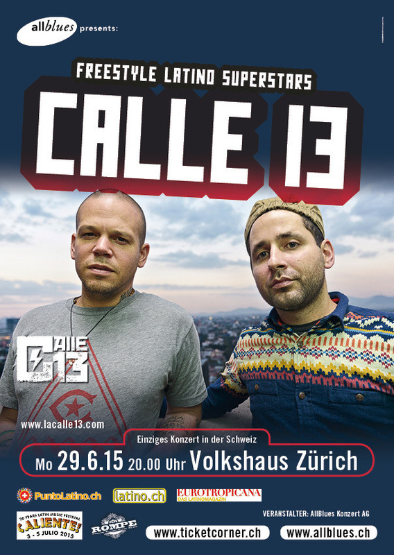 ***CONCIERTO***LIVE*** Freestyle Latino Superstars - CH-exklusiv! Die Puertoricaner Residente und Visitante heben mit ihrem neuen, grammy-gekrönten Album «Multi-Viral» den Latinosound auf ein neues Level. Sie mischen Rock und Electrocsounds zu einem Latino-Cocktail, der durchaus mit Manu Chao zu vergleichen ist. Endlich live in Zürich! EINZIGES KONZERT IN DER SCHWEIZ 19.00h Tür- und Kassenöffnung, Warm-up DJ Copita 20.00h Calle 13 ********************************************************************************* Es hat noch Sitzplatz-Tickets auf dem Balkon (CHF 60/70/75). Stehplätze hat es keine mehr!! Tickets bei Ticketcorner.ch ********************************************************************************* PREISE: CHF 60/70/75 (nummerierte Sitzplätze Balkon/Galerie); CHF 50 (Stehplätze Parkett) VORVERKAUF: http://www.allblues.ch • http://www.ticketcorner.ch • Alle Ticketcorner, Die Post, Manor, SBB, Tel. 0900 800 800 (CHF 1.19/min., Festnetztarif) AKTUELLE CD: MultiViral (2014, Sony) WEBSITE: http://www.lacalle13.com