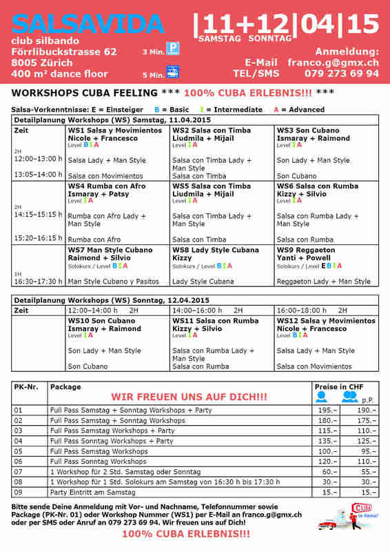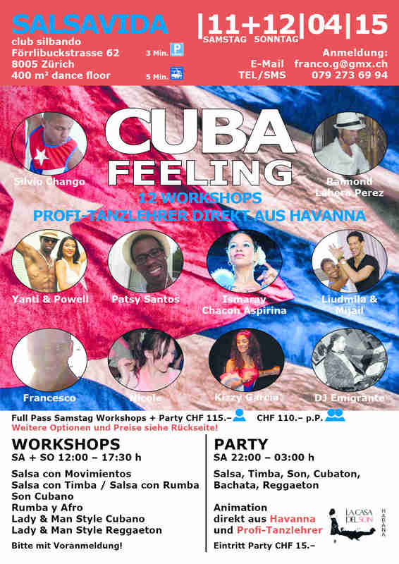 12 WORKSHOPS am Samstag, 11. und / oder Sonntag, 12. April 2015 mit PROFI-TANZLEHRER DIREKT AUS HAVANNA Info und Anmeldung: Francesco - franco.g@gmx.ch - TEL/SMS 079 273 69 94 https://www.facebook.com/events/1415516472084416/ Salsavida CUBA FEELING Party, Samstag, 11.04.2015 ab 22:00 h Mit allen Profi-Tanzlehrern und viel Animation werden wir auf der 400 m2 grossen Pista im Club Silbando, musikalisch angeheizt durch DJ Emigrante und DJ Nono mit Salsa, Timba, Son, Cubaton, Bachata und Reggaeton eine unvergessliche Tanznacht verbringen. Spass, Freude und Unterhaltung ist dabei garantiert! Wir freuen uns auf DICH! Eintritt Party CHF 15.‒ Location: Club Silbando, Förrlibuckstrasse 62, 8005 Zürich Anreise ÖV: Tram: Nr.17 bis Förrlibuckstrasse / Nr.13 bis Escher-Wyss-Platz Bus: Nr. 54, 71, 72, 33 bis Escher-Wyss-Platz / Nr. 54 bis Technopark S-Bahn: Nr. S5, S6, S7, S9, S12 bis Bahnhof Hardbrücke Parkmöglichkeiten: Parkhaus Zürich-West an der Förrlibuckstrasse 151 (303 Parkplätze – 24h) / Puls 5 an der Technoparkstrasse / West-Park an der Giessereistrasse und unter der Hardbrücke. Gehminuten: Escher-Wyss-Platz – Silbando, 6 Minuten / Technopark – Silbando, 6 Minuten / Bahnhof Hardbrücke – Silbando, 12 Minuten Preise der Workshops/Packages auf Flyer oder per Infoanfrage https://www.facebook.com/events/1415516472084416/ Francesco - franco.g@gmx.ch - TEL/SMS 079 273 69 94