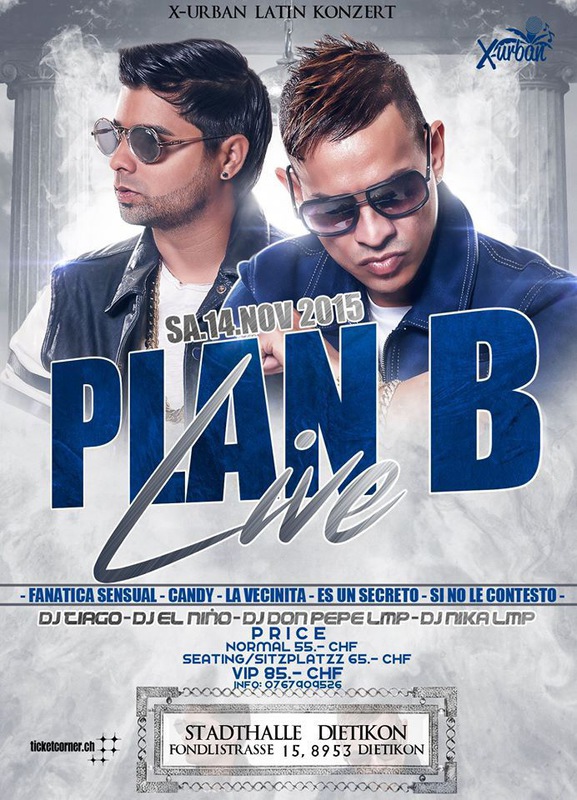 Sa 14. 11. X-Urban Latin Konzert. Live: Plan B (Puerto Rico) DJs Tiago, El Nino, Don Pepe LMP, Nika LMP Vorverkauf Ticket Corner: Stehplatz: CHF 56.50 Sitzplatz unnummeriert: CHF 66.70 VIP - Stehplatz: CHF 86.90 Abendkasse: Stehplatz: CHF 65.00 Sitzplatz unnummeriert: CHF 75.00 VIP - Stehplatz: CHF 95.00 Abendkasse mit LatinoCard: Stehplatz: CHF 50.00 Sitzplatz unnummeriert: CHF 60.00 VIP - Stehplatz: CHF 70.00 Info & Reservations 076 790 95 26 www.Bachaton.ch X-Urban
