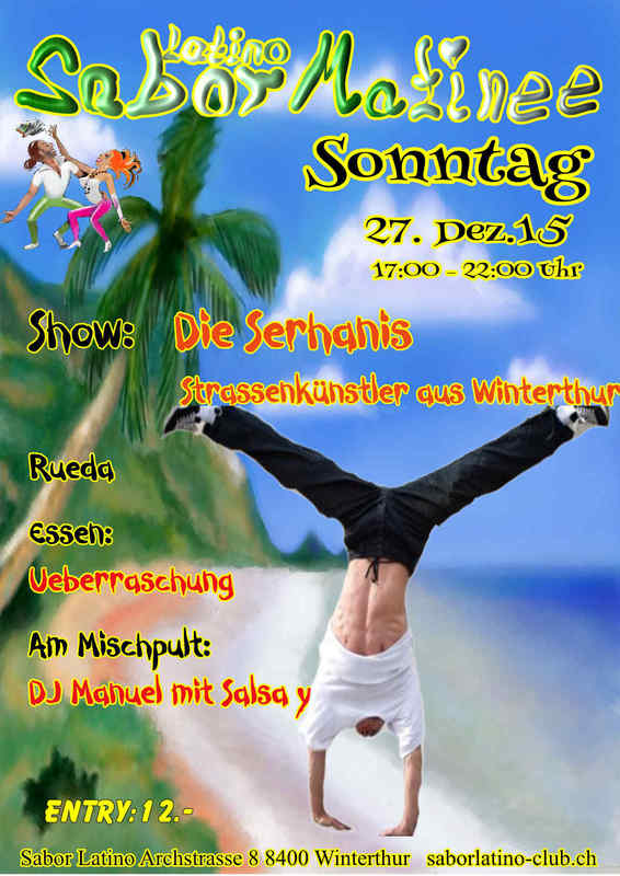 Auch dieses Matinee steht wieder ganz im Zeichen von Spass und Vergnügen. Show: "Die Serhanis" Künstlerfamilie aus Winterthur Essen: Portugiesische Feijoada (Bohneneintopf) Musik: DJ Manuel y su mejor Salsa Entry: 12.- Franken (Essen incl.) 17:00 - 21:00 Uhr