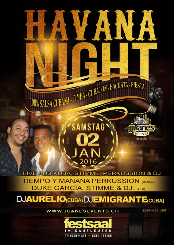 WELCOME TO 2016 WELCOME TO CUBA in Kaufleuten Festsaal *** HAVANA NIGHT SA 02. JAN. 2016 *** von Juanes Party Wir begrüssen HAVANA NIGHT im 2016 im Kaufleuten Festsaal, einen speziellen Abend, Tanzen ohne Pause, Stimme, Perkussion und DJ’s mit der besten kubanischen Musik. Direkt von Italien Kuba **Tiempo y Manana ** Percusión. Duke Garcia, Stimme und DJ Yosley Palma Um es zu vervollständigen haben wir die besten DJ’s, sie spielen die neusten und aktuellsten Themen Kubas. DJ AURELIO (Cuba) DJ EMIGRANTE (Cuba) EINTRITT PREIS: - von 22:00 uhr bis 23:00Uhr CHF 15.- - Ab 23:00UHr CHF 20. Kaufleuten Festsaal Pelikanplatz 8001 Zürich Bienvenidos. Juanes Events www.juanesevents.ch