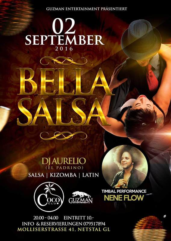 Coco Club & Guzman Entertainment Präsentieren Freitag 02. September 2016 BELLA SALSA -Mit Dj Aurelio und seine Team -Live Performance: Timbal Show (Nene Flow) Eintritt 10.- ( 1 Shot Grattis ) Info & Reservierungen 0795017894 Coco Club Molliserstrasse 41, Netstal Glarus