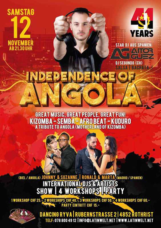 LatinWelt.net präsentiert: Dj Aitor Guez & Dj Segundo ★★41 YEARS INDEPENDENCE OF ANGOLA A Tribute to Angola (MOTHERLAND OF KIZOMBA) 4 WORKSHOPS I 2 Djs I ANIMATION I SHOWS Great Music, great People, Great Fun! 100% Kizomba, Semba, Afrobeat, Kuduro, Salsa, bachata! ★ Dj Aitor Guet, Star Kizomba Dj aus Spanien Dj und Instruktor afrolateinischer Rhytmen, geboren in Vigo (Spanien) war einer der Vorreiter von Kizomba in Galizien, er erteilt Kurse und hat den Kizomba in seinem Unterricht seit mehr als 5 Jahren eingebaut. Aufgrund seiner langjährigen Erfahrung als Dj von afrolateinischen Rhytmen an verschiedenen Veranstaltungen in Spanien und Portugal hat er sich national und international einen Platz in der Welt des Kizomba gefestigt. Zur Zeit ist er für die besten Kizomba Events und Kongresse engagiert, wie das Feeling Kizomba Festival oder das International Kizomba Open in Madrid. Ausserdem ist er aktuell in einem Lokal in der Stadt Vigo tätig, wo er Events, Kurse und Shows den afrolateinischen Rhytmen widmet. ★ SHOW Kizomba Show by Ronald & Marta (Madrid/Spanien) Surprise Show! ★ 4 WORKSHOPS 18.00 - 18.50 Uhr Kizomba Traditional by Johnny & Suzanne 18.50 - 19.40 Uhr Tarraxinha by Ronald & Marta 19.40 - 20.30 Uhr Semba Traditional by Johnny & Suzanne 20.30 - 21.20 Uhr Kizomba Fusion by Ronald & Marta Die Workshops setzt Vorkenntnisse voraus I Nivel Basic - Mittel Stufe ★INSTRUKTOREN Johnny & Suzanne (Biel/Bienne CH / Angola) Ronald & Marta (Madrid & Marta) ★ VORVERKAUF WORKSHOPS + PARTY Pass: 1 Workshops inkl. Party CHF 30.- Pass: 2 Workshops inkl. Party CHF 40.- Pass: 3 Workshops inkl. Party CHF 50.- Pass: 4 Workshops inkl. Party CHF 60.- ★ ABENDKASSE WORKSHOPS + PARTY Pass: 1 Workshops inkl. Party CHF 35.- Pass: 2 Workshops inkl. Party CHF 45.- Pass: 3 Workshops inkl. Party CHF 55.- Pass: 4 Workshops inkl. Party CHF 65.- 21.30 - 03.00 Uhr Party Eintritt CHF 15.- Haben Sie eine Latinweltkarte oder Latino Card gewähren wir Ihnen gerne einen Discount. Anmeldungen und Informationen: info@latinwelt.net I 078 800 49 12 I www.latinwelt.net Parkett Tanzboden - über 280 Gratis Parkplatz Wir freuen uns auf Ihren Besuch und auf einen unvergesslichen Kizomba Abend. Dancing RYVA Team und LatinWelt.net
