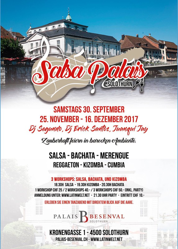 Palais Besenval Solothurn präsentiert: ★★SALSA PALAIS - Dj Segundo & Amigos Salsa, Bachata, Merengue, Reggaeton, Kizomba, Cumbia... Zeit zum Geniessen! Zeit zum Feiern! Willkommen im Palais Besenval Geniessen Sie Zeitgeist im barocken Ambiente. Treten Sie ein und lassen Sie sich von der über 300-jährigen Geschichte unseres Hauses verzaubern. In diesem barocken Ambiente laden wir Sie ein, zu lateinamerikanischen Klängen zu tanzen. Lassen Sie sich zudem von unseren auserlesenen Tapas-Kreationen verwöhnen und geniessen Sie dabei den direkten Blick auf die Aare. ★Zeit: 18.00 Uhr Türöffnung 18.30 Uhr Salsa Workshop 19.30 Uhr Kizomba Workshop 20.30 Uhr Bachata 21.30 Uhr Party beginn ★Preis CHF 25.- 1 Workshop + Party CHF 40.- 2 Workshops + Party CHF 50.- 3 Workshops + Party CHF 10.- Eintritt Party Anmeldung unter: www.latinwelt.net ★Informationen: - Tanzflächen innen - 5 Minuten zu Fuss vom Hauptbahnhof Solothurn - Verschiedene Parkmöglichkeiten (z.B. Parkhaus Baseltor 4 Min., Parkhaus Berntor 6 Min.) Wir freuen uns schon auf dieses neue Ereignis!
