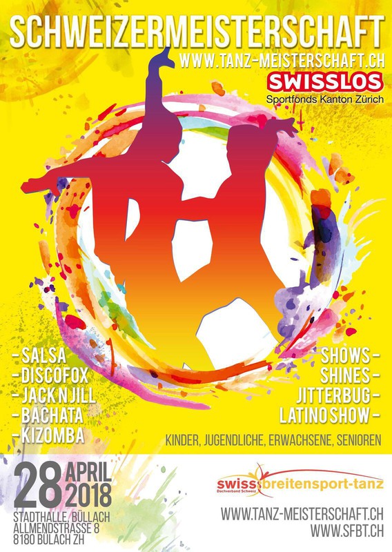 Schweizer Meisterschaft 2018 (Anmeldeschluss Tänzer 10.April 2018) Schweizermeisterschaft 2018 in SALSA, BACHATA, DISCOFOX, KIZOMBA und weiteren Kategorien. Liebe Tänzerinnen und Tänzer 10. April 2018 gesetzt haben. So können wir Dir eine professionelle Zeit Planung geben. Der Austragungsort wird die einmalige Stadthalle in Bülach (ZH) sein – einen exzellenten Platz mit einer stilvollen Atmosphäre für das Publikum & alle Teilnehmenden. Wichtige Links: 1. Kauf der Tickets: https://salsakurse.ch/dcm/school_booking.php?id=34 2. Anmeldung Paare: https://www.tanz-meisterschaft.ch/anmelden 3. Homepage der Schweizer Meisterschaft https://www.tanz-meisterschaft.ch/ 4. Reglemente https://www.tanz-meisterschaft.ch/reglemente 5. Zeitplan (10 Tage vor dem Start on-line) https://www.tanz-meisterschaft.ch/zeitplan ANMELDESCHLUSS – neue Regeln: 1. Anmeldeschluss für die Teilnahme an der SM 2018 ist der 10. April 2018. Anmeldungen werden nur schriftlich angenommen. Es werden keine Ausnahmen gemacht! 2. Die Musik muss bis am 21. April an das OK-Team gesendet werden (bitte dennoch CD mitbringen) info@sfbt.ch 3. Der genaue Zeitplan wird am 22. April 2018 definitiv freigegeben. (vorher sind die Zeitpläne eine ungefähre Annahme). 4. Die Anmeldegebühren sind bis fünft Tage nach der Anmeldung zu bezahlen. 5. Alle Teilnehmenden, die ihre Startzeit am Nachmittag haben,müssen sich zwei Stunden vor ihrer Runde bei der Tänzerregistration vor Ort (in der Halle) anmelden. Diejenigen, die am Abend starten, müssen sich spätestens bis 18.00 Uhr bei der Tänzerregistration melden. Somit müssen nicht alle Tänzer bereits am Vormittag vor Ort sein. Neuigkeit: ab sofort sind Tickets verfügbar. Diese werden gestaffelt frei gegeben. Achtung! Die Tänzerausrichtung am Nachmittag ist von rechts nach links und am Abend von links nach rechts. https://www.tanz-meisterschaft.ch/tickets Habt ihr noch Fragen zum Ablauf, Tanzdisziplinen oder zum Reglement? Ruft uns einfach an oder schreibt uns eine E-Mail: https://www.tanz-meisterschaft.ch/team Kategorien * = Auch für Kinder und Jugendliche in separater Klasse • Salsa IDO * • Bachata * • Bachata Jack n Jill* • Discofox IDO * • Kizomba * • Bellydance • Jack n' Jill (Salsa & Discofox) • Rueda * • West Coast Swing • Tango Argentino • Salsa Shines (Herren / Frauen) * • Latino Show (Solo / Paare / Gruppen) * • Shows (Solo / Paare / Gruppen) * bei der Show-Kategorie ist alles erlaubt: Afro, Rumba, Hip-Hop, Flamenco etc. • Social Dance Salsa Puerto • Social Dance Salsa Cubana • Social Dance Discofox Social Dance: Hier wird das Social Dancing (Ausgangstanz) bewertet. Alle Interessenten können frei mitmachen (ohne Choreographie). Die Jury: https://www.tanz-meisterschaft.ch/jury Der Moderator: Natürlich geht es bei der SM ums Gewinnen, es geht aber auch darum, mal im Leben an einem Turnier teilgenommen zu haben, Erfahrungen zu sammeln, Spass beim Tanzen zu haben und auch ein Feedback von den Richtern zu bekommen. Was wird bewertet? Eine entscheidende Rolle ist die Technik und Ausführung, die Harmonie zwischen dem Tanzpaar, die Musikinterpretation, die äussere Erscheinung und die Kreativität der Choreografie. Unsere Auswahl an Richter findet ihr hier. Die Resultate sollen nicht ein Urteil fürs Leben sein, sondern eine Tagesbewertung, also nur Mut und melde dich an! Nur wenn du dich anmeldest, kannst du auch den Titel gewinnen. Wir freuen uns auf deine/eure Anmeldung! Location: Stadthalle Bülach Allmendstrasse 8 8180 Bülach ZH Tänzerische Grüsse und see you there! Die Organisatoren der SM www.tanz-meisterschaft.ch