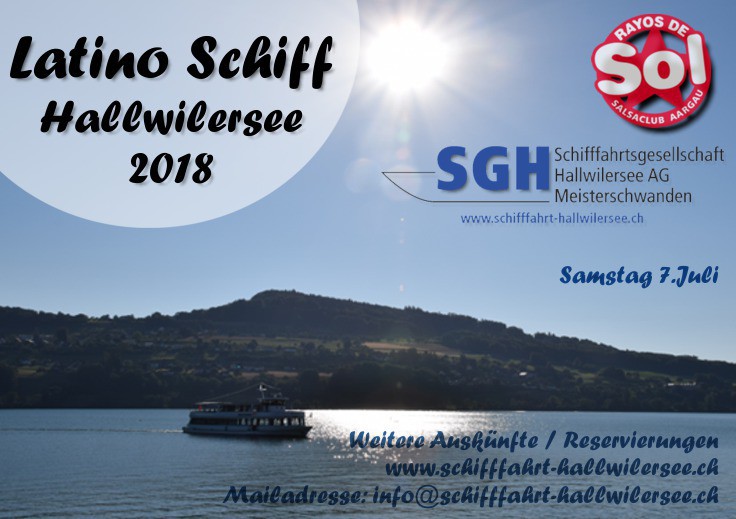 In Zusammenarbeit mit Salsa Club "Rayos de Sol" und der Schifffahrtsgesellschaft Hallwilersee stechen wir am Samstag um 19:30 Uhr auf See. Begleitet von bester Salsa Musik Bachata und vieles mehr. DJ Dario, DJ Yuma, DJ José. Perkussion; Luisito Aballe von "Conjunto Salsometro" Animation; "Edit by Rayos de Sol" WICHTIG; Reserviere Deinen Platz auf info@schifffahrt-hallwilersee.ch oder, 056 667 00 00