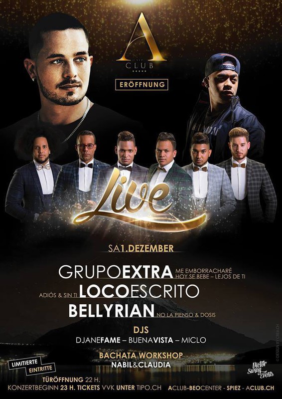 Um die Eröffnung des A-Club zu zelebrieren, ist live Musik angesagt. International bekannte Künstler wie Descemer Bueno mit seinen Hits wie "Bailando", "Subeme la radio" und '"Nos fuimos lejos". Grupo extra mit "me emborracharé" und "hoy se bebe", Loco Escrito "Sin ti" und "Adios". Bellyrian "No la Pienso". Zum ersten mal in der Schweiz aus Kuba: Alain Pérez y la Orquesta. All diese Künstler werden für Gänsehaut sorgen. Freitag 30. November und Samstag 1. Dezember sollte man sich im Kalender freihalten! Freitag: Alain Pérez / Descemer Bueno Samstag: Bellyrian / Loco Escrito / Grupo Extra DJ's: DJane Fame - Buena Vista - Saltho - Miclo Tanzanimation: Mijail Galano - Buena Vista & Victor Swing Samstag um 21:00 Uhr. Bachata Workshop mit Nabil & Claudia A Club: Simmentalstrasse 50, 3700 Spiez https://tipo.ch/acluberöffnung Tickets für Freitag und Samstag sind getrennt erhältlich. https://www.aclub.ch/event