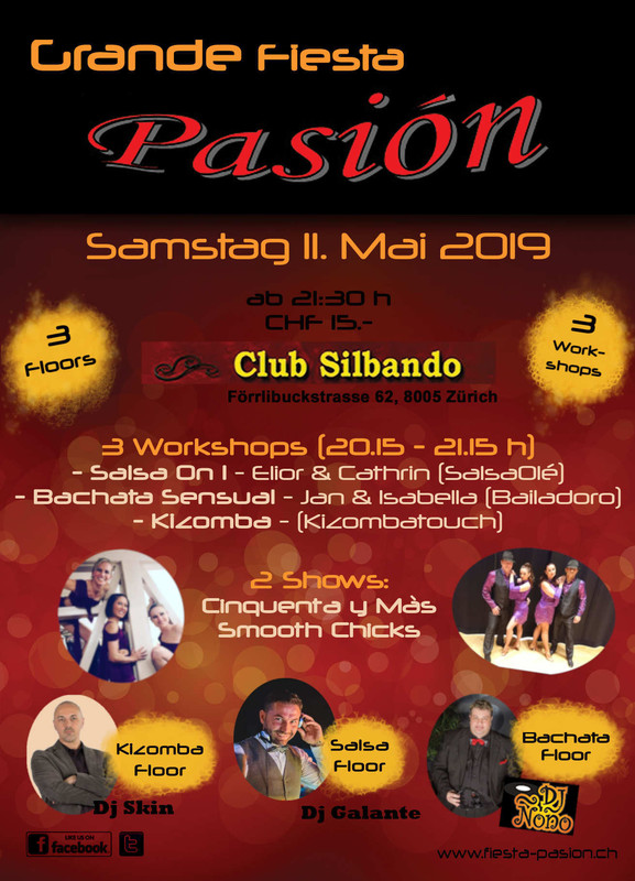 "Grande Fiesta Pasión": Drei grosse Floors mit Salsa (Dj Galante), Bachata (DJ Ñoño) und Kizomba (Dj Skin). Vor der Party finden von 20:15 - 21.15 Uhr drei Wokshops statt (20.- CHF inkl. Party-Eintritt): - Salsa on 1 mit Elior & Cathrin (SalsaOlé) - Bachata Sensual mit Jan & Isabella (Bailadoro) - Kizomba mit Kizombatouch Drei Shows "Cinquenta y Más", "Smooth Chicks" (DanceART Winterthur) und "Salsabrosa Chair Bootcamp by Jenny Leone" werden uns den Abend verzücken! Party ab 21.30 Uhr, Freier Eintritt für Frauen bis 22 Uhr Abendkasse 15.- CHF Achtung: Für Gäste, die mit dem Auto anreisen, bitte unbedingt das "Parkaus West" (Förrlibuckstrasse 151) benutzen, da auf dem Fiesta Pasion-Areal nicht überall geparkt werden darf. Party-Daten 2019: (jeden zweiten Samstag des Monates) Samstag 12.1.2019 Samstag 9.2.2019 Samstag 9.3.2019 Samstag 13.4.2019 Samstag 11.5.2019 Samstag 8.6.2019 Samstag 13.7.2019 Sommerpause Samstag 14.9.2019 Samstag 12.10.2019 (12 Jahre Grande Fiesta Pasión) Samstag 9.11.2019 Samstag 14.12.2019 Weitere Infos auf: www.fiesta-pasion.ch oder info@fiesta-pasion.ch http://www.fiesta-pasion.ch http//www.fiesta-pasion.ch