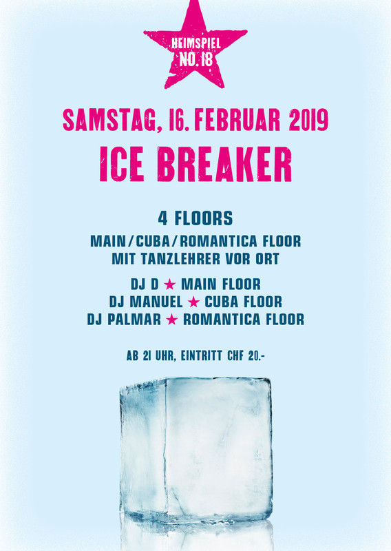 Bei den Heimspielen muss man einfach dabei sein ;-) Samstag, 16. Februar 2019 Heimspiel No. 18 - ICE BREAKER 4 Floors: Main, Cuba, Romantica Floor mit Tanzleherer vor Ort Ab 21h Eintritt CHF 20.- Line up: DJ D Main Floor DJ Manuel Cuba Floor DJ Palmar Romantica Floor Schüler der Kursperiode, in der das jeweilige Heimspiel stattfindet, erhalten beim Bezahlen des Kurses einen Gutschein, mit dem sie für 5.- (anstatt 20.-) ans Heimspiel können. https://www.bananenreiferei.ch