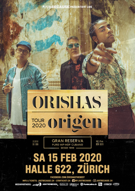 Das legendäre kubanische Rap Trio Orishas ist zurück. Nachdem ihr erstes Zürcher Konzert nach 10 Jahren im Mai 2019 innert Wochen restlos ausverkauft war, dürfen sich Fans erneut auf das Beste aus zwanzig Jahren Bandgeschichte freuen. Am 15 Februar 2020 geben die Orishas ein weiteres Konzert in der Halle 622 in Zürich. Die drei Latin Music Götter - “Orishas” steht für naturverbundene Gottheiten - werden ihre Fans ebenso mit neuen Songs wie “Everyday” oder “Despójame” wie auch den Klassikern wie “El Kilo” und “Represent” ihres Debüt-Albums “A Lo Cubano” von 1999 zum Tanzen bringen. Nach einer längeren Pause fand die Band 2015 wieder zusammen und veröffentlichte seitdem zwei Alben - “Emigrante” in 2015 und 2018 eben “Gourmet”, welches für den Latin Grammy nominiert wurde. Wir freuen uns jetzt schon darauf, wenn Ruzzo, Yotuel und Roldán mit ihrem feurigen Mix aus Alternative Hip Hop und Latin Urban die Halle 622 mitten im tiefsten Winter aufheizen werden! Mit ihrer Musik haben die Orishas schon zwei Grammys und einen Latin Grammy gewonnen und gut 800’000 Kopien ihrer Alben verkauft https://justbecause.ch/artists/artist/orishas