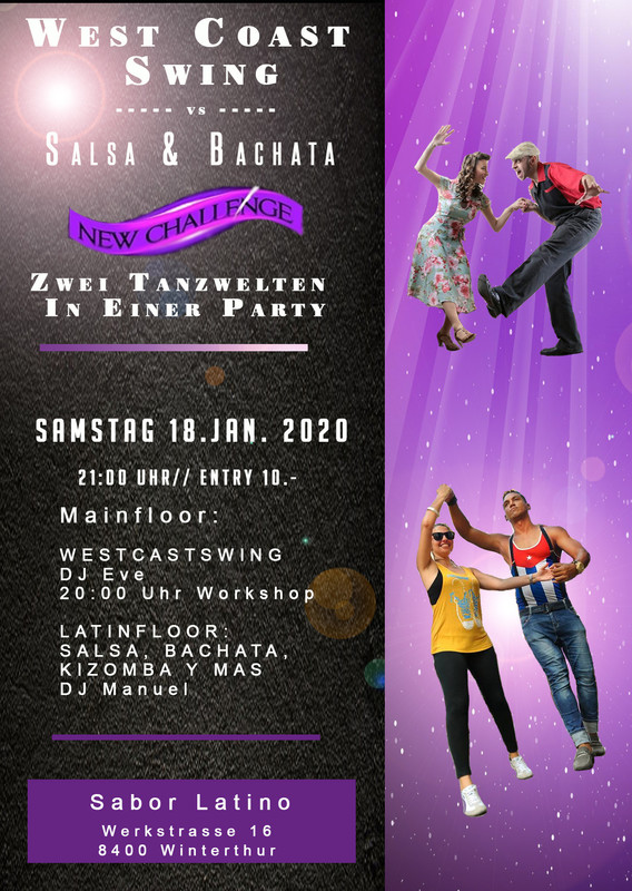 Westcoastswing vs. Latino?? Das ist neu im Sabor Latino. Wir bringen die Tanzwelt zusammen. Lass Dich darauf, lerne einen neuen Tanz und neue Menschen kennen. Auf 2 Dancefloors könnt Ihr an diesem neuen Vergnügen teilnehmen. Vor der Party bieten wir einen Westcoastswing Workshop: Mainfloor: Westcoastwing DJ Eve 2nd. Floor: Salsa, Bachata, Kizomba DJ Manuel Vor der Party um 20:00 Uhr gibt es einen WCS Workshop https://www.facebook.com/events/594321844719756/ saborlatino.ch