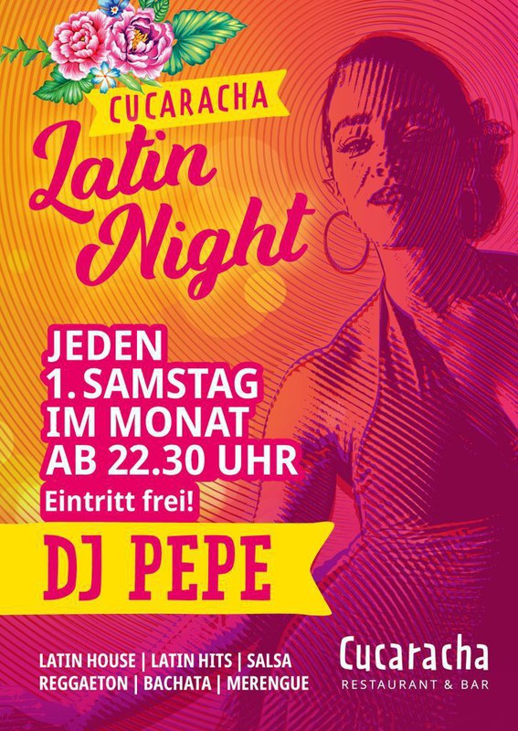 Für dich und deine Freunde haben wir das perfekte Abendprogramm für ein ausgelassenes Wochenende! Tanze zu heissen Latin Beats aufgelegt von DJ Pepe, dazu gibt's beste Cocktails und leckeres Essen. Jeweils am 1. Samstag im Monat ab 22:30 Uhr, Eintritt frei! https://www.facebook.com/cucaracha.basel