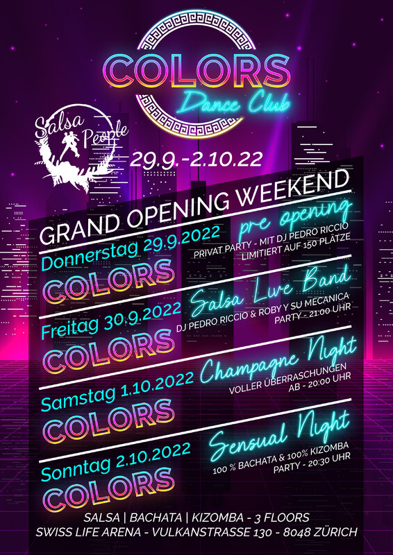 The Grand Opening - Salsa People Zurich Lass dich entführen und geniesse die atemberaubende Magie der neuen Event Location von Salsa People bei der Swisslife Arena in Zürich! Es erwartet dich ein Spektakel das 4 Tage anhält und entzückt dich jeden Tag aufs Neue mit den bezaubernden Shows im "COLORS CLUB". Die Champanger Show wird dir noch lange im Gedächtnis bleiben! 🙂 PROGRAMM INKL. PREISE: Donnerstag - 29.09.22 PRE-OPENING PRIVAT PARTY (max. 100 Pers.) CHF 15 - Tickets auf Anfrage Freitag - 30.09.22 SALSA LIVE BAND - ROBY Y SU MECANICA & PARTY CHF 20 - Eintritt Samstag - 01.10.22 THE GRAND OPENING - CHAMPAGNE NIGHT (max. 100 Pers.) CHF 130 - Champagne Night & Show inkl. Party Do-So CHF 25 - Nur Afterparty Eintritt Sonntag - 02.10.22 EL FINAL PARTY CHF 15 - Eintritt SPECIAL OFFER: CHF 50 Party Pass (DO-SO) FULL PASS: CHF 120 für Champagner Show inkl. Party Pass ** SALSA | BACHATA | KIZOMBA | ** TICKETS: Anmeldung via www.salsapeople.ch Eventfrog.ch: https://eventfrog.ch/salsapeople-preopening https://eventfrog.ch/salsapeople-liveband https://eventfrog.ch/salsapeople-champagnenight https://eventfrog.ch/salsapeople-sensualnight Wir freuen uns sehr auf Dich! 🙂 https://www.salsapeople.ch/workshop