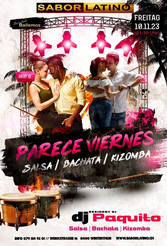 Die richtige Party, um das Wochenende zu beginnen. Mit wechselnden DJ`s immer Salsa, Bachata und Kizomba und auch mal Reggaeton. Floor 1: DJ Paquito: Salsa, Bachata, Kizomba Floor 2: DJ PiHunter Discoswing und mehr Free Parking vor dem Club und mit dem ÖV ist das Sabor Latino einfach erreichbar bis Haltestelle Grüzenstrasse oder Brücke. Auch die Nachtbusse fahren im 1/2 Stundentakt an und ab diesen Haltestellen. Im Sabor Latino gibt es auch eine Tanzschule: www.bailemos.ch www.saborlatino.ch