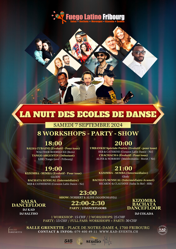 🔥FUEGO LATINO FRIBOURG & LES ECOLES DE DANSE !!!🔥 *************L'union fait la force************* Apres la belle période estivale, Fuego Latino Fribourg va à la rencontre des Ecoles de Danse. A la faveur de cette édition spéciale venez nombreux découvrir les diverses facettes de : ★Salsa Cubana ★Salsa Ladysttyling ★Bachata ★Kizomba .★Chacha ★Tango Plusieurs écoles, profs, élèves, groupes de shows seront au rendez-vous… ★PROGRAMME DES WORKSHOPS★ ❀❀❀❀❀❀ 18H ❀❀❀❀❀❀ ☛SALSA CUBAINE (Evolutif - Pour tous) WALTHER RODRIGUEZ (Bern) ☛TANGO ARGENTIN (Débutant - Pour Tous) LISE (Tango Love - Fribourg) ❀❀❀❀❀❀ 19H ❀❀❀❀❀❀ ☛KIZOMBA - SEMBA (Evolutif - Pour Tous) GLODY ☛BACHATA SENSUAL (Intermédiaire) SEB & CATHERINE (Corazon Latin Dance - Ne) ❀❀❀❀❀❀ 20H ❀❀❀❀❀❀ ☛URBANKIZ (Spéciale Portée pour tous) SEB & CATHERINE (Corazon Latin Dance - Ne) ☛CHACHACHA (Pour tous) ALINE & NORBERT (Mambomania - Morat / Ne) ❀❀❀❀❀❀ 21H ❀❀❀❀❀❀ ☛KIZOMBA - SEMBA (Intermédiaire) GLODY ☛BACHATA SENSUAL (Intermédiaire-Avancé) RICARDO & CLAUDINE (Salsa In Biel - SIB) ★★★★23H : SHOWS DES ÉCOLES★★★★ ☛NORBERT & ALINE (MAMBOMANIA) ★★★22H - 2H30 : PARTY / 2 DANCEFLOORS★★★ ☛SALSA DANCEFLOOR DJ KAD DJ SALTHO ☛KIZOMBA & BACHATA DANCEFLOOR DJ COLADA ★★★★★ PRIX ★★★★★ ☛1 WORKSHOP:15CHF ☛2 WORKSHOPS:25CHF ☛PARTY : 15CHF ☛FULL PASS : WORKSHOPS + PARTY : 30CHF ADRESSE : Salle Grenette, Place Notre-Dame 4 1700 Fribourg (Suisse) ::::::::::::::::VENEZ NOMBREUX:::::::::::::::: SOUTENIR - DÉCOUVRIR - ESSAYER - APPRÉCIER !!! Contact & Infos : KAD : 079 400 49 11 ADRESSE : Salle Grenette, Place Notre-Dame 4, 1700 Fribourg CONTACT : 079 400 49 11, kad-events.ch www.kad-events.ch
