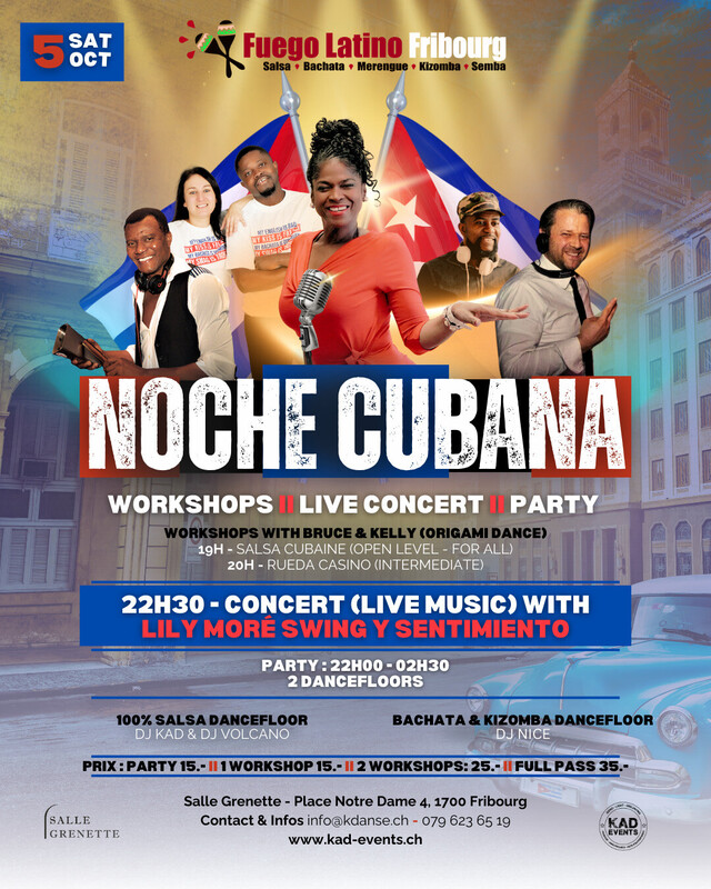 ★☆★N O C H E * C U B A N A★☆★ ____SAM. 5 OCTOBRE 2024____ ====P R O G R A M M E==== ☆ WORKSHOPS ☆ LIVE CONCERT ☆ PARTY ☆ ANIMATIONS ☆ 💢19H00 - 20H00 - WORKSHOP💢 SALSA CUBAINE (OPEN LEVEL for All) BRUCE & KELLY (Origami Dance - VS) 💢20H00 - 21H00 - WORKSHOP💢 RUEDA CASINO (INTERMEDIATE) BRUCE & KELLY (Origami Dance - VS) ★★★ 22H30 : SALSA CONCERT LIVE ★★★ ____LILY MORÉ SWING Y SENTIMIENTO_____ Lily Moré will be on stage with her band, to make you dance !!! Don't miss it. ★★★★★★★★★★★★★★★★★★★★★★ 💢21H30 - 02H30 PARTY- 2 DANCEFLOORS💢 ☆ SALSA DANCEFLOOR☆ *** DJ KAD (FRIBOURG) *** DJ VOLCANO (BERN) ☆ KIZOMBA & BACHATA DANCEFLOOR ☆ *** DJ NICE (FRIBOURG) ==========PRIX========== PARTY : 15.- / 1 WORKSHOP : 15.- / 2 WORKSHOP 25.- FULL PASS : 35.- LIEU: SALLE GRENETTE, Place Notre-Dame 4, 1700 fribourg INFOS : 079 400 49 11 WWW.KAD-EVENTS.CH www.kad-events.ch