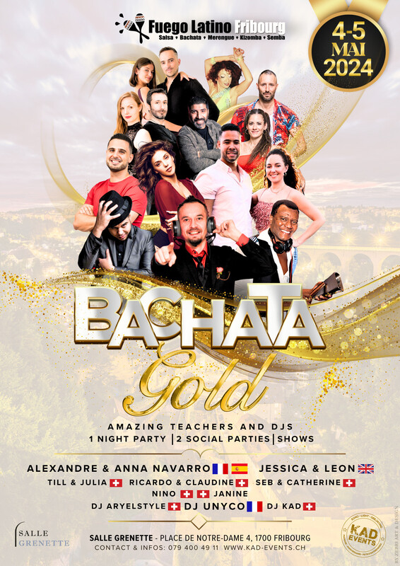 ❀✿❀FUEGO LATINO FRIBOURG❀✿❀ =======BACHATA GOLD======= ▅▅▅▅▅ 4 - 5 MAI 2024 ▅▅▅▅▅ Pour le mois de Mai 2024, Fuego Latino Fribourg, Kad Events vous invite à un week-end de bachata avec des artistes internationaux et nationaux de haut niveau ainsi que des Djs pour vous faire vibrer pendant la Soirée ou le Social party. Vous êtes danseur de la bachata avec un niveau avancé, internetaire ou débutant. Des profs expérimentés seront présents pour vous. Nous vous attendons nombreux à la Salle Grenette - Fribourg pour le week-end BACHATA GOLD. PROFS, DJS ainsi que les membres du STAFF vous feront passer un week-end inoubliable. ▁▂▃▄▃▂ 2 JOURS : 4 - 5 MAI 2024 ▂▃▄▃▂▁ WORKSHOPS TOUS NIVEAUX ✅ OPEN NEVEL ✅ INTERMEDIATE ✅ ADVANCED ✅ MASTER CLASS ▄▄▄▄▄▄▂▂ PARTY ▂▂▄▄▄▄▄▄ ✅ SOCIAL PARTY (SATURDAY) ✅ PARTY (SATURDAY) !!! ✅ SOCIAL PARTY (SUNDAY) !!! ▄▄▄▄▄▄▂▂ SHOWS ▂▂▄▄▄▄▄▄ ▄▄▄▄▄▄▂▂ LINE UP ▂▂▄▄▄▄▄▄ ★ INTERNATIONAL & NATIONAL ARTIST ◄★★★▁LINE UP TEACHERS▁★★★► ★► ALEXANDRE (FRANCE) & ANNA NAVARRO (ESPAGNE) ★► JESSICA & LEON (RUMBA LATINA - UK) ★► TILL & JULIA (SUISSE) ★► RICARDO & CLAUDINE (SIB - SUISSE) ★► SEB & CATHERINE (CORAZON LATIN DANCE - SUISSE) ★► JANINE (SUISSE) ★► NINO (SALSA Y DULZURA - SUISSE) ◄★★★▁LINE UP DJS▁★★★► ★► DJ UNYCO (FRANCE) ★► DJ ARYELSTYLE (SUISSE) ★► DJ KAD (SUISSE) ▄▄▄▄▄▄▂▂ BILLETERIE ▂▂▄▄▄▄▄▄ 🔺🔺🔺🔺PRICES ONLINE🔺🔺🔺🔺 🔺 FULL PASS SOLO : 90 CHF 🔺 FULL PASS COUPLE (1 LEADER & 1 FOLLOWER) : 170 CHF 🔺 DAY PASS (SATURDY) : 70 CHF 🔺 DAY PASS (SUNDAY) : 50 CHF 🔺 PARTY : 20 CHF 🔺MASTER CLASS : 45 CHF🔺 - For good dancers - Not included in the full pass - For only 20 participants =====The Ticketing Link===== https://my.weezevent.com/fuego-latino-bachata-gold-4-5-mai-2024 ======================== 📆 DATE : 4 - 5 mai 2024 📍 ADRESSE : Salle Grenette, Place Notre-Dame 4, 1700 Fribourg CONTACT : 079 400 49 11, djkad@bluewin.ch www.kad-events.ch www.kad-events.ch