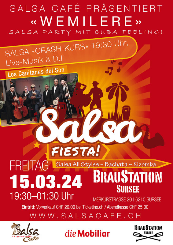 Am 15. März 2024 feiern wir unsere nächste Salsa Fiesta Wemilere in der Braustation Sursee. Wir starten um 19.30 Uhr mit einem Salsa Crash-Kurs. Das Highlight des Abends das live Konzert von Los Capitanes del Son. Dazwischen gibt es DJ Sound Salsa All Styles, Bachata, Kizomba. Vamos a beilag. Jetzt das Ticket sichern unter www.ticketino.ch. https://www.ticketino.com/de/Event/Salsa-Fiesta-Wemilere-mit-Konzert-von-Los-Capitanes-del-Son/186866?loggedInAsCustomer=true