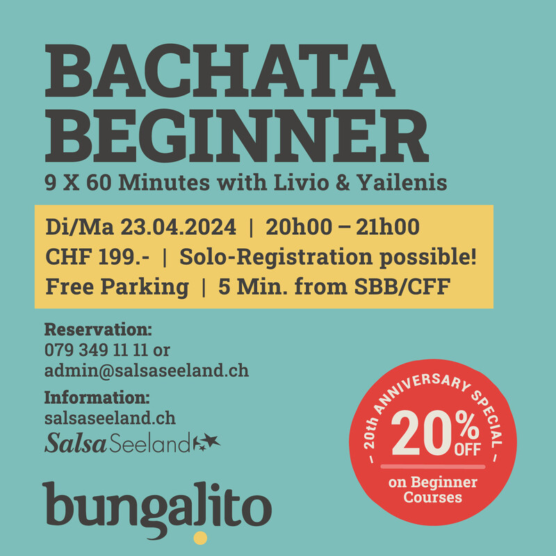 9 x 60 Minutes with Livio & Yailenis Solo-Registration possible! Free Parking / 5 Min. from SBB/CFF Reservation: 079 349 11 11 or admin@salsaseeland.ch www.salsaseeland.ch