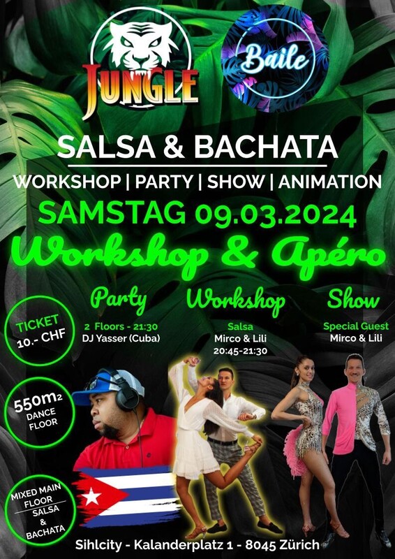 SALSA & BACHATA EVENT TICKETS: https://eventfrog.ch/de/p/party/latin-brasil/salsa-bachata-event-baile-salsa-special-7167768461048784443.html *** SALSA | BACHATA *** *** 1 MIXED DANCE FLOOR *** *** 1 WORKSHOP *** *** SPECIAL GUEST MIRCO & LILI *** *** DJ YASSER (CUBA) *** FULL PASS 10 CHF WORKSHOP PLAN 20:45-21:30 SALSA - MIRCO & LILI PARTY START 21.30 Uhr Lass dich entführen und geniesse die atemberaubende Magie der neuen Event Location im Shopping Center SIHLCITY in Zürich! Es erwartet dich ein Spektakel mit bezaubernden Shows im ""THE JUNGLE CLUB"". === THE JUNGLE CLUB === Kalanderplatz 1 | 8045 Zürich Wiedikon | Sihlcity https://baile.ch/next-events.html https://baile.ch/next-events.html