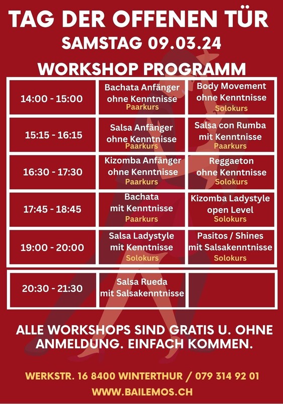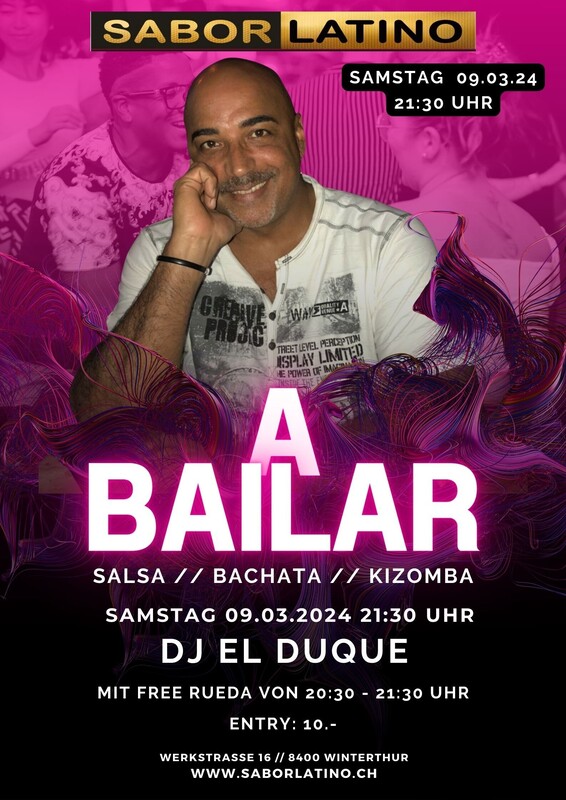 A Bailar, karibische Lebensfreude präsentiert durch die beste Musik von unseren DJ`s. Salsa, Bachata, Kizomba und auch Merengue wird er auflegen. Floor 1: DJ: El DuqueSalsa / Bachata / Kizomba 20:30 - 21:30 Uhr findet ein gratis Rueda Workshop statt Alle Infos zum Tag der offenen Tür: https://bailemos.ch/tag-der-offenen-tuer/ www.saborlatino.ch