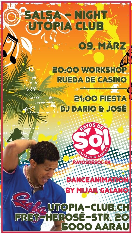 A bailar con salsa de la buena - In Aarau!!! Con DJ Dario & DJ José de Salsa Club Aargau "Rayos de sol". 20:00 - 21:00 Workshop "Rueda de casino" con Mijail Galano de cuba. Preis; 15.- pro Person. (Ohne Anmeldung) Paarweise von Vorteil. Animation "Mijail Galano". www.rayosdesol.ch