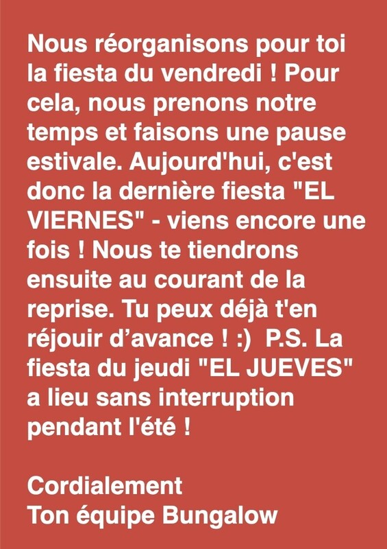 Wir gestalten für dich die Fiesta am Freitag neu! Dafür nehmen wir uns Zeit und machen eine Sommerpause. Heute ist deshalb die letzte Fiesta «EL VIERNES» - komm noch mal vorbei! Danach melden wir uns, wenn es wieder los geht. Du kannst dich schon jetzt darauf freuen! :) P.S. Die Fiesta am Donnerstag «EL JUEVES» findet während dem Sommer durchgehend statt! Liebe Grüsse – Dein Bungalow-Team ************************************************ CE SOIR DERNIÈRE VENDREDI-FIESTA AVANT LA PAUSE D'ÉTE ! Nous réorganisons pour toi la fiesta du vendredi ! Pour cela, nous prenons notre temps et faisons une pause estivale. Aujourd'hui, c'est donc la dernière fiesta "EL VIERNES" - viens encore une fois ! Nous te tiendrons ensuite au courant de la reprise. Tu peux déjà t'en réjouir d’avance ! :) P.S. La fiesta du jeudi "EL JUEVES" a lieu sans interruption pendant l'été ! Cordialement - Ton équipe Bungalow