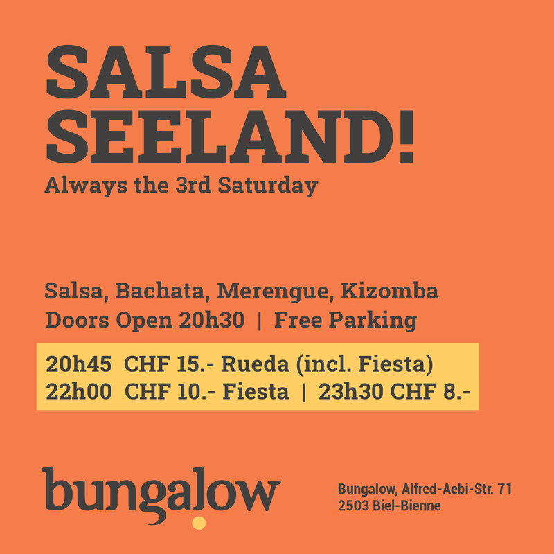Every 3rd Saturday - Salsa, Bachata, Merengue, Kizomba 20h30 Doors open / Free Parking 20h45 Rueda CHF 15.- (incl. Fiesta) 22h00 Fiesta CHF 10.- / 23h30 CHF 8.- OR Reserve the Fiesta Lounge! 22h00 CHF 100.- (incl. Free Entry for you and all your guests) Information & Reservation: bungalow-bienne.ch https://www.bungalow-bienne.ch