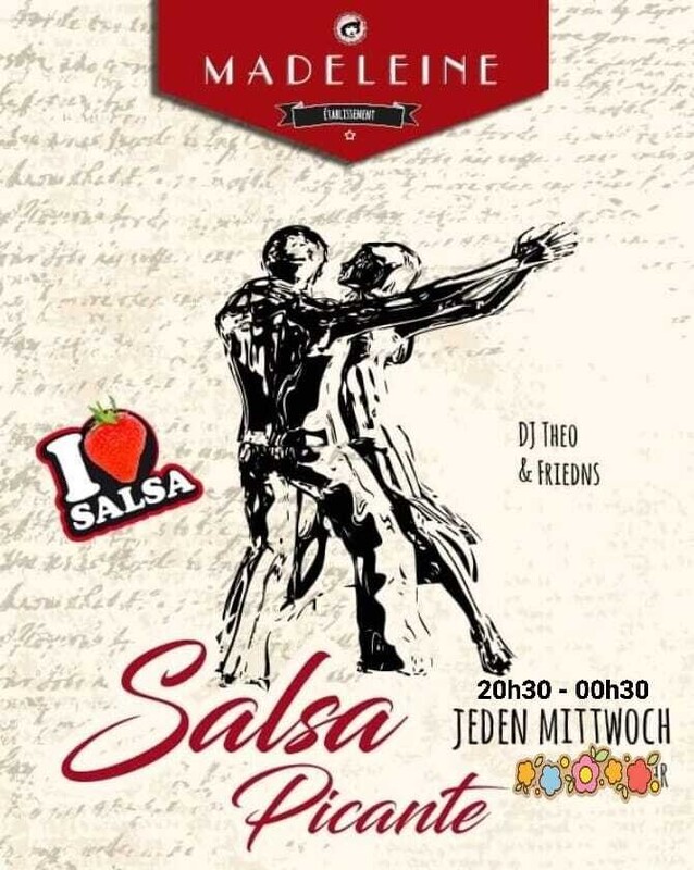 Fiesta Salsa Picante JEDEN MITTWOCH SALSA IN LUZERN MI DJ THEO 20.00h bis 00:30h Tanz zu Salsa All Styles, Bachata All Styles oder Latin Hits💃🏻🕺🏻 DJ Theo spielt die Perlen aus der Latino Welt. SALSA, BACHATA, MERENGUE, CHA CHA, LATIN HITS Madeleine feiert die Lateinamerikanische Lebensfreude, das Highlight für tanzende mit Feuer im Arsch und Sinnlichkeit in den Bewegungen. - - - Unser Sonnenscheinanlass am Mittwoch-Abend - wie Urlaub im Süden, und dies inmitten von Luzern. 🔥 - - - Freier Eintritt 20.00 Uhr bis 00:30 Uhr - - - MADELEINE Baselstrasse 15, 6003 Luzern, www.lamadeleine .ch