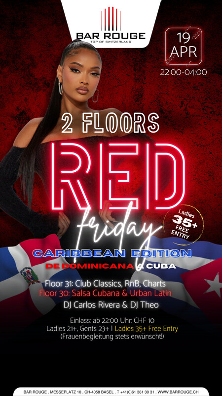Every Friday is RED FRIDAY! Auf dem unteren Floor bringen wir mit Caribbean Edition das karibische Flair nach Basel! Music: _Floor 30: Salsa Cubana, Bachata & Urban Latin _Floor 31: Top50 Charts, Pop, HipHop, RnB https://www.barrouge.ch/de/events/red-friday19042024/