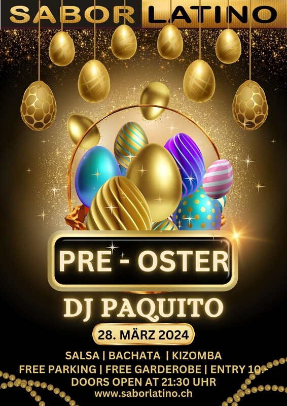 Pre Oster Party: Wir möchten mit Euch zusammen die freien Osterfeiertage beginnen, natürlich mit dem, was uns Allen Spass macht: Salsa, Bachata, Kizomba und auch mal Merengue. Bist Du dabei? Mit DJ Paquito www.saborlatino.ch