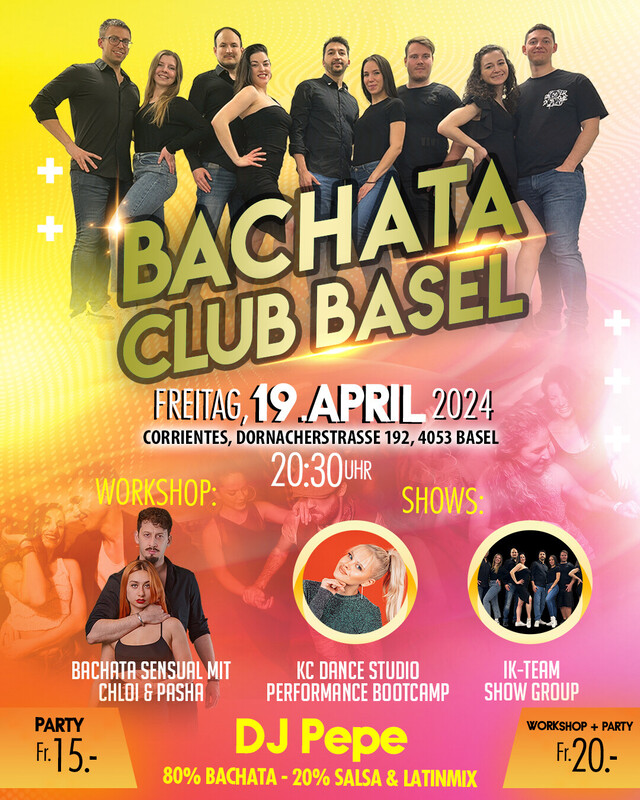 BACHATA CLUB Basel mit DJ Pepe Freitag, 19. April 2024 Unsere Bachata-Party-Reihe geht am 19. April 2024 weiter. Workshop BACHATA SENSUAL mit Chloi & Pasha startet um 20:30 Uhr bis 21:30 Uhr. Danach ist Party mit dem besten Bachata Songs. Um Mitternacht zeigen wir die Bachata-Shows von KC Dance Studio Performance Bootcamp und IK-Team Show Group. Wir freuen uns auf zahlreiche Bachateras & Bachateros aus Frankreich, Deutschland und der Schweiz. Eintritt Party: Fr. 15.- Party und Workshop: Fr. 20.- Corrientes Dornacherstrasse 192 4053 Basel