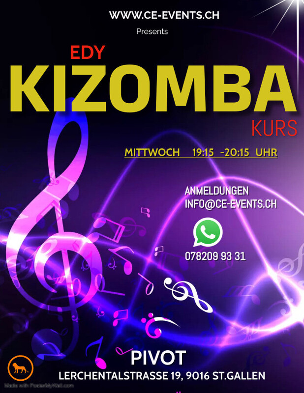 Kizomba Kurs ab Mittwoch den 07. Mai mit Edy von 19.15 - 20.15 Uhr. Kurs: 4x 1 Std. Kosten: 100.-- (Pro Lektion 25.-Fr.) Wichtig Anmeldung für den Kurs: C & E Events GmbH / Pivot unter: info@ce-events.ch oder Tel. 078 209 93 31 Anschliessend Clubabend ab 20.30 Uhr DJ in Rotation mit Salsa, Bachata, Kizomba, Merengue Wir freuen uns auf schöne Abende mit Euch!!! www.ce-events.ch