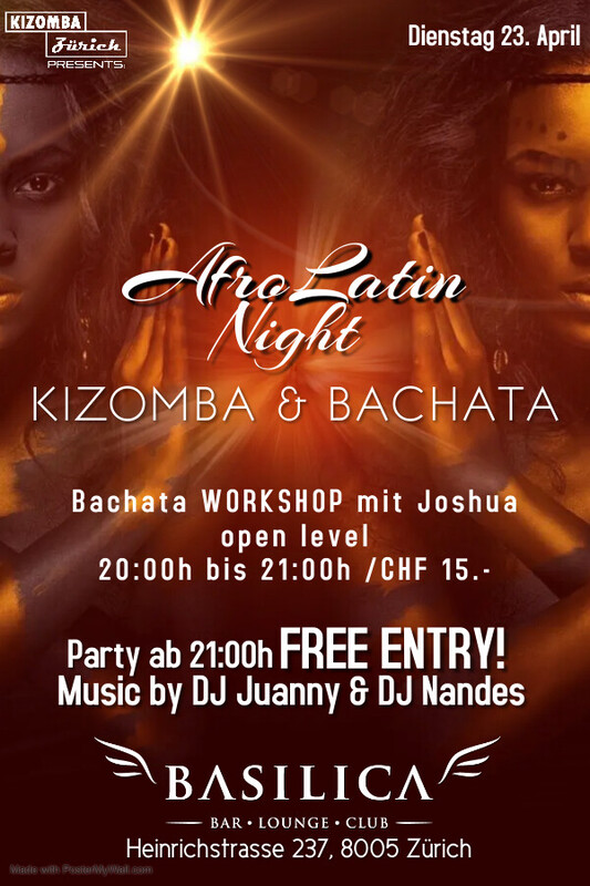 DIENSTAG 23. April - BACHATA WORKSHOP mit JOSHUA open level /CHF 15.- - MUSIC by DJ Juanny & DJ 'Nandes Workshop from 20:00h - 21:00h Party from 21:00h - open end "Das BASILICA ist am Dienstag schon ab 17:00h für alle geöffnet und der Eintritt ist frei". _____________________________ BASILICA - BAR * LOUNGE * CLUB Heinrichstrasse 237 8005 Zürich https://www.facebook.com/events/3734188706836169