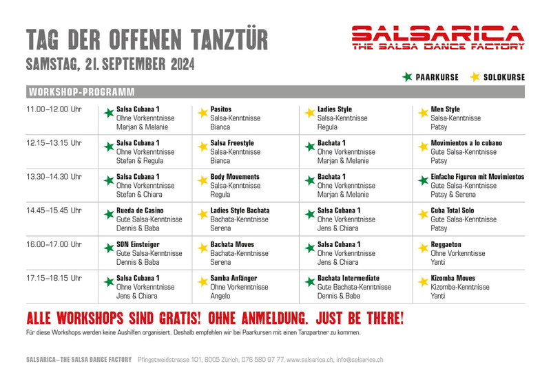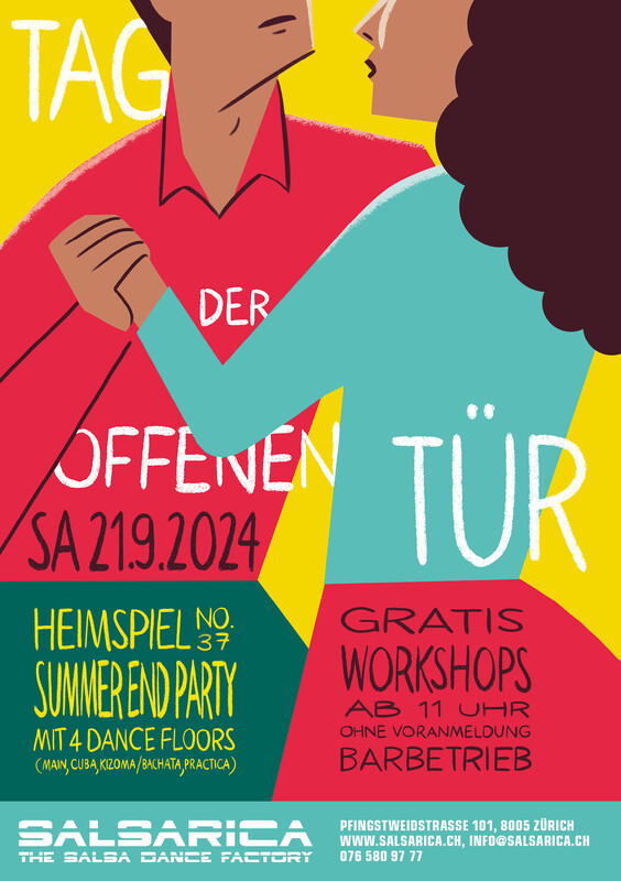 Tag der offenen Tür Freut euch auf verschiedene gratis Workshops von 11 - 18h. Ohne Voranmeldung! Wir öffnen unsere Tore wieder für alle Tanzinteressierte (und auch solche, die es noch werden könnten), die bei uns reinschnuppern, oder ganz einfach für alle, die einen Tag Tanz gratis und franko geniessen möchten. Angeboten werden diverse Workshops in diversen Stilen von unseren Lehrern. Freut euch auf Salsa Cubana, Rueda, Bachata, Kizomba, Ladies Style, Reggaeton und vieles mehr:) Es kann... - gratis getanzt werden, mit oder ohne Vorkenntnisse (11-18.15) - das Glücksrad gedreht werden - gemütlich was getrunken werden - einen feinen Hotdog oder Sandwich bestellt werden - auf der gemütlichen Dachterrasse gechillt werden - an unserer Party Heimspiel No 37 bis in die Morgenstunden getanzt werden (ab 21h) https://www.salsarica.ch/news-reader-salsarica/items/tag-der-offenen-tanztuere.html