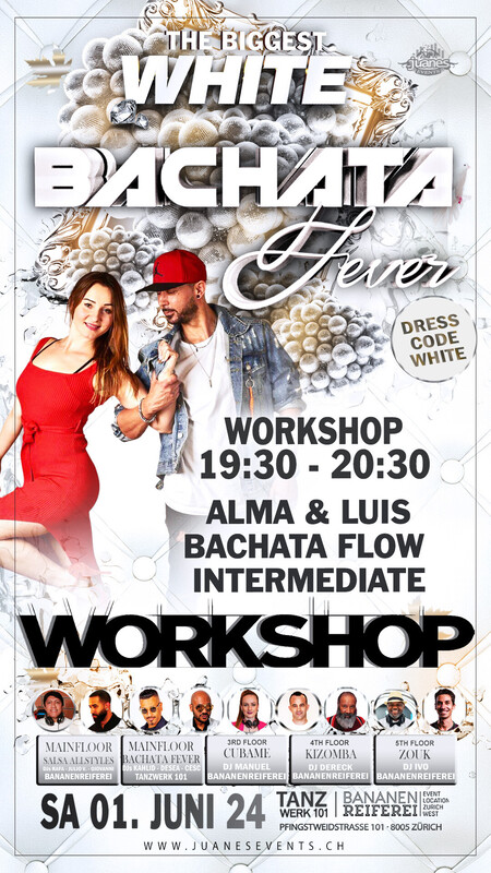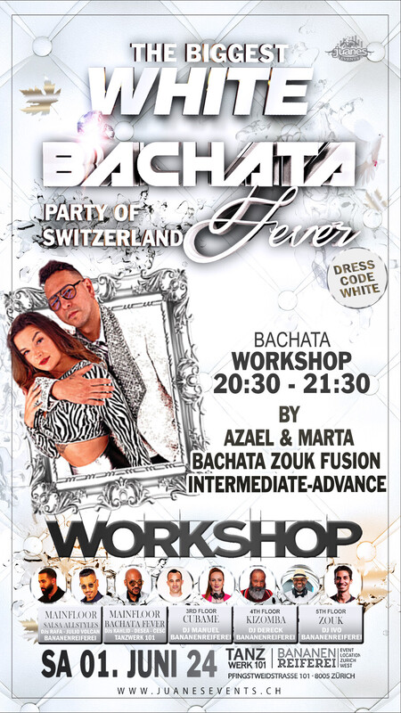 BACHATA WORKSHOPS SAMSTAG 01. JUNI Bananenreiferei & Tanzwerk 101 ◎ 19:30 bis 20:30 Uhr ◎ ALMA & LUIS ◎ Bachata Flow ◎ Nivel: Intermediate (Bananereiferei) ◎◎ ◎ 20:30 BIS 21:30 Uhr ◎ AZAEL & MARTA ◎ Bachata Zouk fusion ◎ Nivel: Intermediate - Advance (Bananereiferei) ◎◎ Sie brauchen nicht zu buchen, kommen Sie direkt zum Bananenreiferei am Samstag 01. Juni 24 um 19:15 Uhr. Der Workshop Preis ist CHF 30.- Inkl. Garderobe & Party auf 5 Dance Floors. ◎◎◎◎ ◎ THE BIGGEST WHITE SALSA AND BACHATA FEVER PARTY IN SWITZERLAND ◎ Samstag 01. JUNI 2024 Bananenreiferei & Tanzwer 101 Zürich ◎◎◎ LOCATION: BANANENREIFEREI & TANZWERK 101 Pfingstweidstrasse 101 8005 Zürich http://juanesevents.ch/