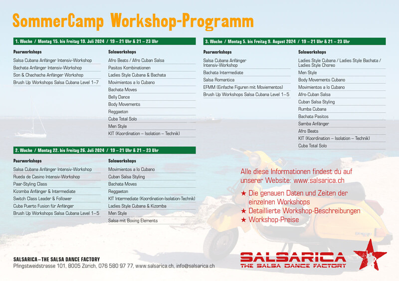 🌞🌴🌞🌴🌞🌴🌞🌴🌞🌴🌞🌴🌞🌴🌞🌴🌞🌴 3 Wochen SommerCamp...... 1. Woche: 15. - 19. Juli 24 2. Woche: 22. - 26. Juli 24 3. Woche: 05. - 09. August 24 Das Programm ist online und buchbar unter: https://www.salsarica.ch/sommercamp-workshops.html Für alle die den Sommer in der schönen Schweiz verbringen und keine Salsapause einlegen wollen! Bei uns gibts in den Sommerferien ein Sommercamp, absolut wetterunabhängig und mit ganz viel Optionen. 🌞🌴🌞🌴🌞🌴🌞🌴🌞🌴🌞🌴🌞🌴🌞🌴🌞🌴 https://www.salsarica.ch/sommercamp-workshops.html