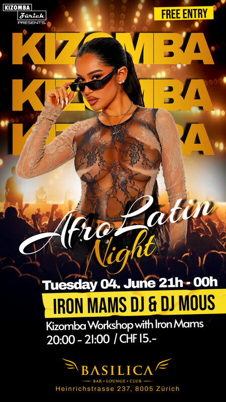 DIENSTAG 04. Juni - KIZOMBA Workshop by Iron Mams - MUSIC by Iron Mams DJ & DJ Mous Workshop from 20:00h - 21:00h Party from 21:00h - midnight. "Das BASILICA ist am Dienstag schon ab 17:00h für alle geöffnet und der Eintritt ist frei". _____________________________ BASILICA - BAR * LOUNGE * CLUB Heinrichstrasse 237 8005 Zürich https://www.facebook.com/events/769811848661838