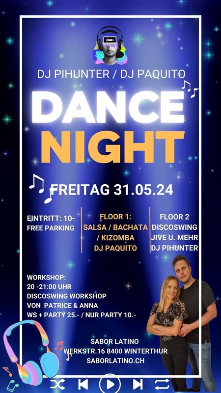 Dance Night, die Party von Salsa, Bachata, Kizomba bis Discoswing auf 2 Dancefloors. Der besondere Event für alle Fans von Discoswing, Jive, Salsa, Bachata und Kizomba! Auf zwei Dancefloors bieten wir beste Musik zum Tanzen und sorgen für einen unvergesslichen Abend in angenehmer Atmosphäre. Erleben Sie mit uns eine Nacht voller Rhythmus und Leidenschaft und geniessen sie einen unserer Cocktails. Floor 1: Salsa, Bachata, Kizomba u. mehr DJ Paquito Floor 2: Discoswing, Jive und mehr mit DJ PiHunter Vor der Party findet ein Discoswing Workshop mit Patrice & Anna statt. Party & Workshop: 25.- / Nur Party 10.- https:/saborlatino.ch