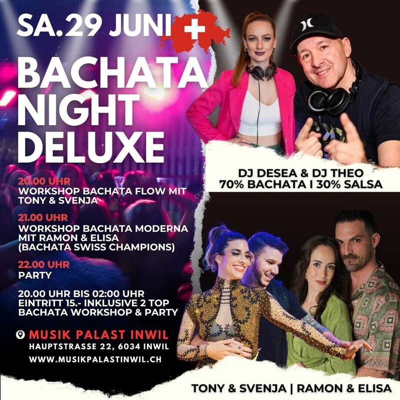 Samstag 29. Juni 2024 -------------------------- BACHATA NIGHT DELUXE Dance Night Party mit Gast DJ Desea & DJ Theo -------------------------------------------------------- 70% Bachata I 30% Salsa - 20.00 Uhr Workshop Bachata Flow mit Tony & Svenja - 21.00 Uhr Workshop Bachata Moderna mit Ramon & Elisa (2 x Bachata Swiss Champions 🏆 2022 & 2023) ------------------------------------------------ 20.00 Uhr bis 02:00 Uhr Eintritt 15.- Inklusive 2 Top Bachata Workshop & Party MUSIK PALAST INWIL Hauptstrasse 22, 6034 Inwil I www.musikpalastinwil.ch Willkommen im Musik Palast Inwil Ihrem Ort für unvergessliche musikalische Erlebnisse. Geniessen Sie die vielfältige Auswahl an Getränken in gemütlicher Atmosphäre. Lassen Sie sich verzaubern von einer Vielfalt von Live-Bands, Live-Konzerten, DJ- und Tanzveranstaltungen. https://www.facebook.com/share/VtXUkt4DhVfS1SJ7/