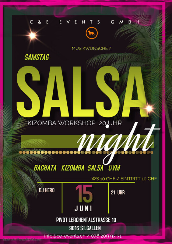 Lasst uns abtanzen und das Leben feiern am Samstag den 15.Juni im Pivot in St.Gallen!! Kizomba Workshop mit Edy von 20.00 – 21.00 Uhr Workshop 10 CHF / Party: Eintritt 10.00 CHF Party ab 21.00 Uhr mit DJ Hero mit Salsa, Bachata, Kizomba uvm. Musikwünsche ?! Workshop Anmeldung und Infos: Phone 078 209 93 31 oder per Mail an info@ce-events.ch Wir freuen uns auf einen schönen Abend mit Euch! https://ce-events.ch