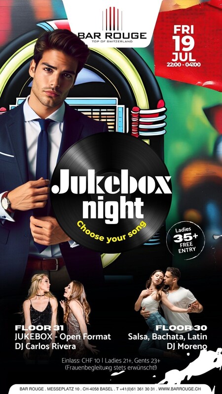Schwinge im 30. Stock deine Hüften zu heissem, leidenschaftlichem und mitreissendem Salsa & Latin! Tanze mit uns durch die Nacht bis es hell wird. Join the club! Bereit für die ultimative Party, bei der DU den Ton angibst? Einen Freitag im Monat verwandeln wir die Bar Rouge im 31. Stock in die heisseste Jukebox der Stadt! Music: _Floor 30 Salsa, Bachata, Latin _Floor 31 Jukebox - Open Format https://www.barrouge.ch/de/events/Jukebox19072024/