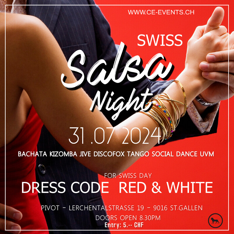 Lasst uns abtanzen und das Leben feiern am Mittwoch den 31. Juli im Pivot in St.Gallen!! For Swiss Day Dress Code: Red - White Eintritt CHF 5 Party ab 20.30 Uhr mit DJ Hero Salsa Bachata Kizomba Jive Discoswing Tango uvm. Infos: Phone 078 209 93 31 oder per Mail an info@ce-events.ch Wir freuen uns auf einen schönen Abend mit Euch! CE-EVENTS.CH