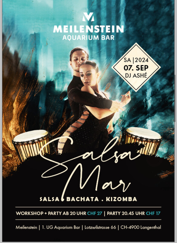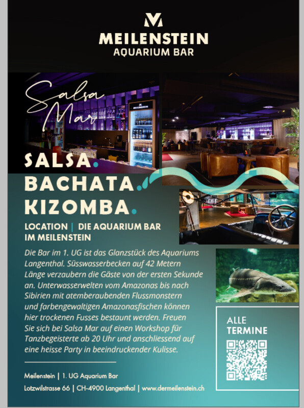💃 Salsa Mar 💃 Die Bar im 1.UG ist das Glanzstück des Aquariums Langenthal. Süsswasserbecken auf 42 Metern Länge verzaubern die Gäste von der ersten Sekunde an. Unterwasserwelten vom Amazonas bis nach Siebirien mit atemberaubenden Flussmonstern und farbengewaltigen Amazonasfischen können hier trockenen Fusses bestaunt werden. Freuen Sie sich bei. 💃Salsa Mar💃 Auf einen Workshop für Tanzbegeisterte ab 20.00-20.45 und anschliessend 20.45 auf eine heisse Party In beeindruckender Kulisse bis 02.00 Workshop & Party. 27.- 20.00-02.00 /Party 17.- 20.45-02.00 💃Bachata Workshop 💃 Freundlich erwarte ich Dich auf eine weitere Unvergessliche Party Lg Reto & Team