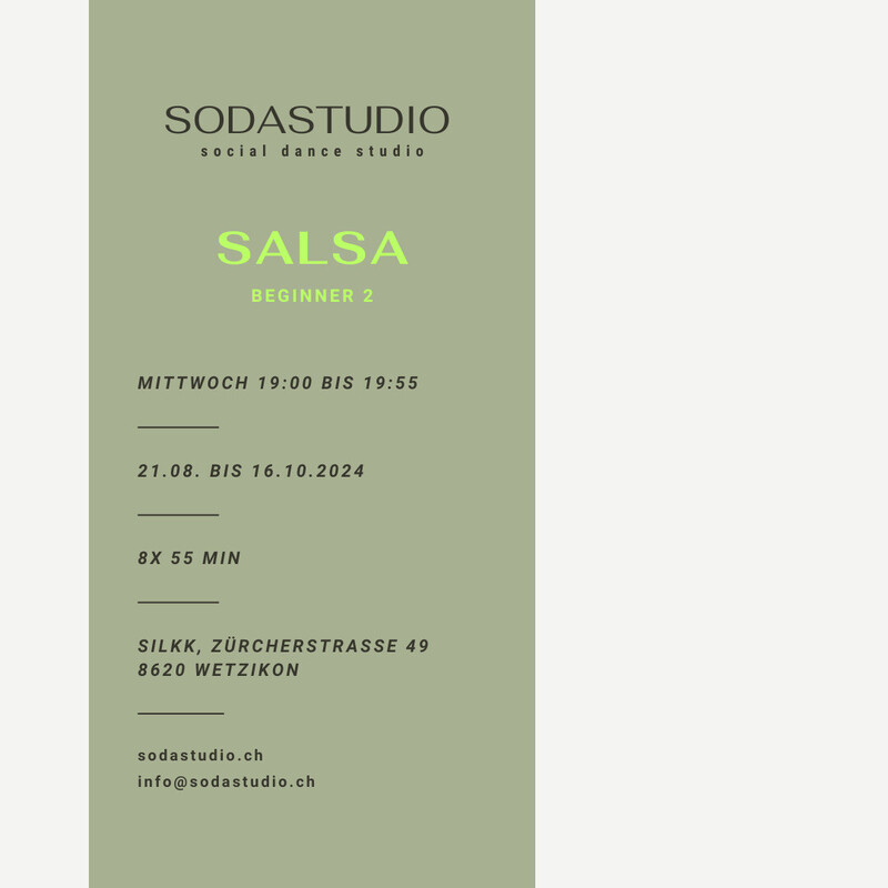 Starte deine Salsa Reise mit uns! Unsere Salsa Beginner 2 Class richtet sich an Teilnehmer mit ersten, kleinen Vorkenntnissen, an Wiedereinsteiger und an alle, die Interesse haben ihre Grundlagen auszubauen und zu festigen. Wir trainieren die wichtigsten Grundlagen des Salsa, damit du in Kürze auf der Tanzfläche Spass haben kannst. Wir erklären dir den Aufbau von Salsa Musik und du lernst anhand von coolen Übungen die Rhythmik zu verstehen und mit deinem Körper umzusetzen. Einfache Figuren kannst du nach diesem Kurs fliessend tanzen. Lass dich von uns auf eine Reise voller Spass, Musikalität und Lebensfreude mitnehmen! Was du in diesem Kurs lernst: - Du lernst den Grundschritt und verschiedene Variationen des Grundschritts. - Wir schulen dein Taktgefühl und vermitteln dir erste Konzepte im Führen und Folgen. - Du lernst die wichtigsten Positionen und einfache Figuren. - Du übst mit und ohne Partner. Kursdaten und Preis: MI 21. August bis MI 16. Oktober 2024 | 19:00 - 19:55 (MI 2. Oktober kein Kurs) 8x 55 Min. | 240.-/Person Deine Tanzlehrer: Wir, Francesco und Mirjam von sodastudio, freuen uns darauf, dich auf deinem tänzerischen Weg zu begleiten und mit dir viele unterhaltsame und lehrreiche Stunden zu verbringen! Kontakt bei Fragen: Du kannst uns jederzeit über unser Kontaktformular auf sodastudio.ch oder per Mail info@sodastudio.ch kontakieren. https://www.silkk.ch/kurse/Salsa-Beginner24-08-2024-19009-23