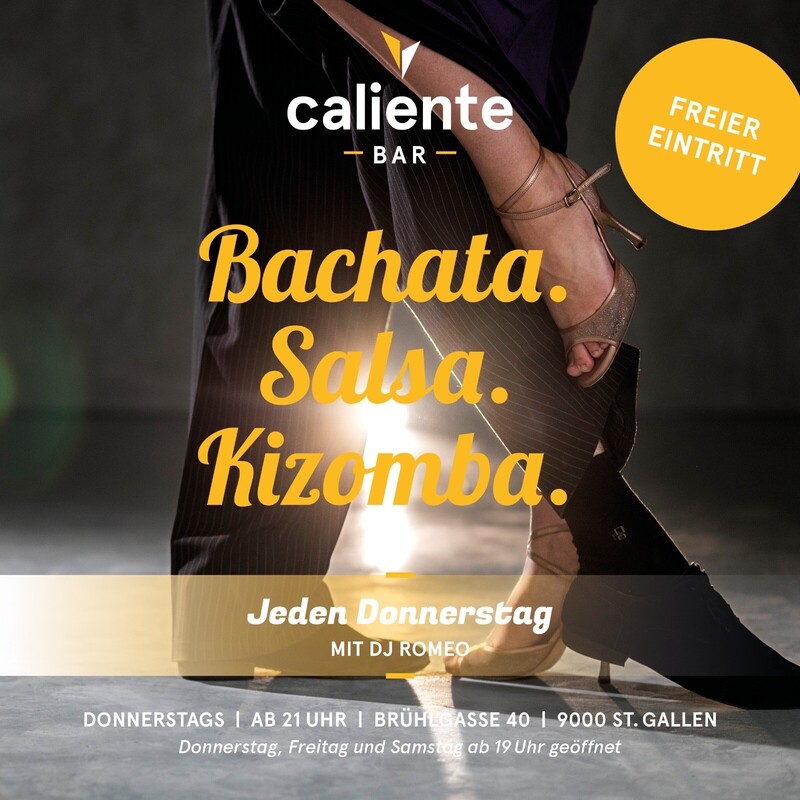 Jeden Donnerstag hast du in der Caliente Bar in St. Gallen die Möglichkeit, zu heissen Salsa-, Bachata und Merengue-Rhythmen deine Freude am Tanzen auszuleben. Wir öffnen unsere Türen um 19 Uhr und DJ Romeo sorgt ab 21 Uhr für eine heitere Stimmung. Wir freuen uns auf deinen Besuch.
