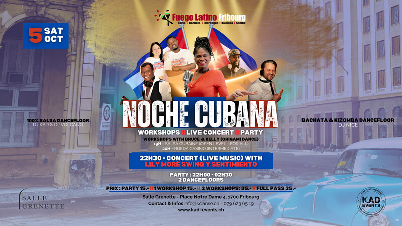 ★☆★N O C H E * C U B A N A★☆★ ____SAM. 5 OCTOBRE 2024____ ====WORKSHOPS PROGRAMME==== 💢19H00 - 20H00 - WORKSHOP💢 SALSA CUBAINE (OPEN LEVEL for All) BRUCE & KELLY (Origami Dance - VS) 💢20H00 - 21H00 - WORKSHOP💢 RUEDA CASINO (INTERMEDIATE) BRUCE & KELLY (Origami Dance - VS) ★★★ 22H30 : SALSA CONCERT LIVE ★★★ ____LILY MORÉ SWING Y SENTIMIENTO_____ Lily Moré will be on stage with her band, to make you dance !!! Don't miss it. ★★★★★★★★★★★★★★★★★★★★★★ 💢21H30 - 02H30 PARTY- 2 DANCEFLOORS💢 ☆ SALSA DANCEFLOOR☆ *** DJ KAD (FRIBOURG) *** DJ VOLCANO (BERN) ☆ KIZOMBA & BACHATA DANCEFLOOR ☆ *** DJ NICE (FRIBOURG) ==========PRIX========== PARTY : 15.- / 1 WORKSHOP : 15.- / 2 WORKSHOP 25.- FULL PASS : 35.- LIEU: SALLE GRENETTE, Place Notre-Dame 4, 1700 fribourg INFOS : 079 400 49 11 WWW.KAD-EVENTS.CH