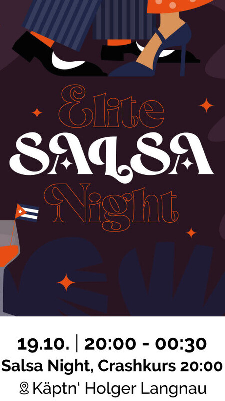 Die traditionelle, kleine und feine Salsa-Party in Langnau 20:00 Crashkurs mit Yanieri Martinez 20:00 bis 00:30, Salsa Party mit DJ Schnaquito Eintritt frei, Kollekte Drinks und Häppchen vom Käpt'n Holger Barteam https://www.kaeptnholger.ch/